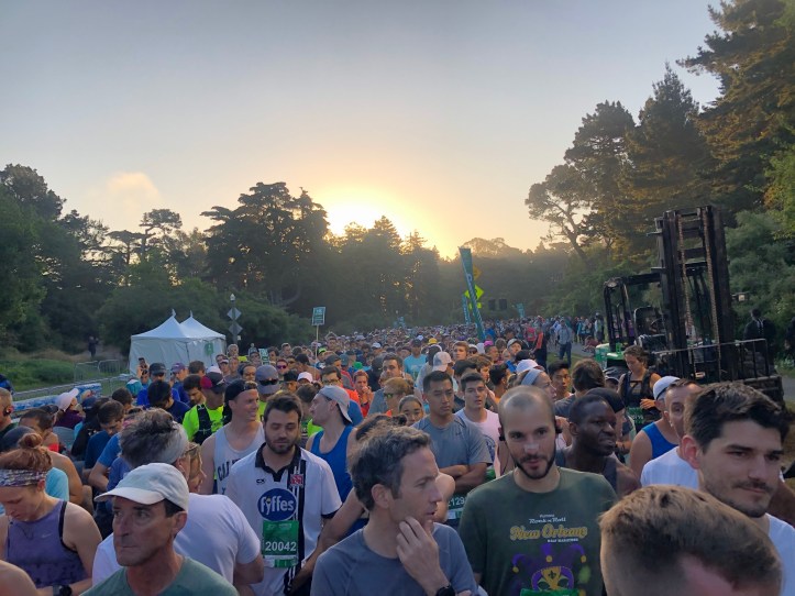 Arrival was pretty stressful as I had to have the driver drop me far from the start and I had to run across a busy thoroughfare to get to the start. Also, I’d been on edge and angry at the race for 24 hours as they screwed up my corral/seeding. I had originally signed up for the marathon, but several months prior to the race, and within their change window, I changed to this race. I gave them my estimated finish time (in retrospect a bit ambitious). However, they put me in the last corral, which was basically walkers, meaning I’d start 20 or more minutes behind people running my pace. They also would not move me at the expo. I’ve run in races recently where they are strict about corrals so I was worried this would effectively be a lost race for me. However, I had no problem jumping into the correct corral.